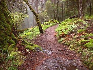 The descent is not constant. The trail levels out at times and provides time for introspection. At this point, it travels through a riot of greens. Along the trailside is a profusion of ferns. This is accentuated by the emerald green moss that covers the trees. The darker green of the redwood foliage provides the perfect backdrop to this scene.