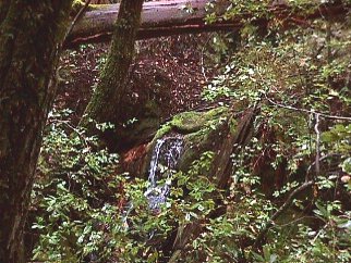 From the top of middle ridge, the trail has steadily descended toward West Waddell Creek. As it nears this destination, the trail passes many grottos containing small seasonal tributaries. The advantage of taking this hike after the winter rains, is in being able to see the many diminutive waterfalls before they dry up. Here is just one example of these small but exuberant streams.