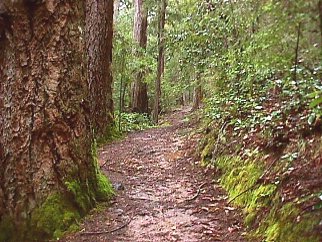 The ascent finally reaches the summit of the second ridge. As the trail levels out one can take a well deserved rest and observe the surroundings. The redwoods still predominate and here three large specimens stand guard over the hiker. The nearest one is a superb example of old growth redwood. It is fortunate indeed that it was spared by the loggers.