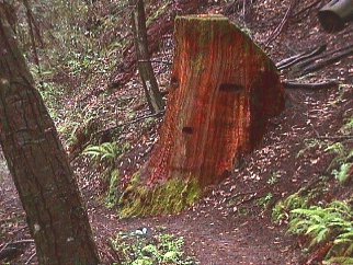The trail now taunts the hiker by once again descending to another creek only to climb one more ridge. It with some surprise that this strange apparition appears by the path. Could some Polynesian tribe have landed here and built a monument to their gods? Actually, these are notches used by loggers to wedge boards into. They then stood on them to fell the tree.