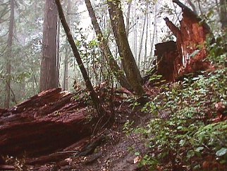 As the ascent continues, the mist again swirls around and through the forest. It lends an eerie yet peaceful enchantment to the land. Suddenly, a broken remnant of a tree looms out from the fog. It acts as a reminder that even in this seldom visited portion of the park, nothing can last forever.