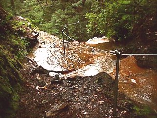 It is only a brief walk from the last of the cascades before the top of Silver Falls comes into view. At first you wonder if the trail has been washed out because it leads over the top of the falls. Rest assured, this is the trail, and it does follow the falls as it drops over the cliff. This is the only trail I have seen that does this. The pipes and cable, if used wisely, will allow a safe but exhilarating journey to the base of the falls.