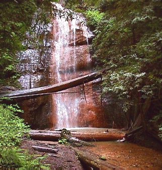 It is with some trepidation that you follow this dubious trail as it attempts suicide by leaping over the edge of the falls. The first part of this adventure consist of carefully lowering yourself along the edge of the falls. You must have full confidence in the pipe and cable system to ensure that no misstep is taken, for a fall could have grave consequences. About half way down, the trail veers away from the falls and takes a more rational route the rest of the way down. Once at the foot of the falls it is time to pause and enjoy the beauty here. While little is written of Silver Falls, I find it more impressive than Berry Creek Falls.