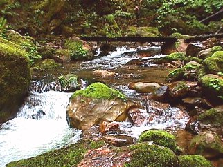 The trail parallels Waddell Creek as it slowly begins an ascent which will culminate once again at the top of Middle Ridge road. After a short walk, it crosses the creek on this footbridge. Unlike the other bridges encountered, this is a temporary construction. To prevent it from washing to the sea, it is removed during the winter rainy season. Crossing then requires wading across the swollen creek.