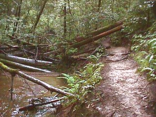 Having seen the beginning of Timms Creek trail so long ago on our journey, we now arrive at its southern terminus. So much wreckage as been caused by this years storms that if not for the forlorn signpost we would not realize the trail existed. The pile of broken trees lying across the creek is the remains of the bridge crossing the creek. Much work needs to be done before this trail can be safely used again.