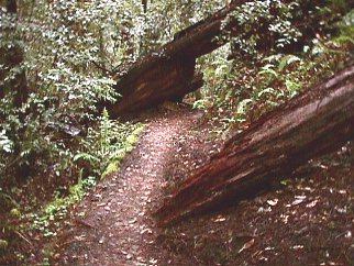 Sometimes a tree will fall across a trail that is too large to completely remove. There are two methods that the park service will use to correct the problem. The easiest way is to simply reroute the trail around the obstacle. When there is no room to reroute, a more creative means must then be found. This usually involves removing enough material to allow a hiker to pass, as can be seen here.