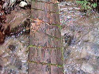 Having crossed over to the east side of Fall creek, it is now time to cross back over to the west side, in order to reach Cape Horn trail. The perspective shown here is of a person looking down into the waters of Fall Creek while traversing the footbridge. Like its predecessor, it is a single log with a leveled top.. In addition, groves are notched on it, to enhance the footing of the wary traveler. All in all, a very nice job has been done by the park service.