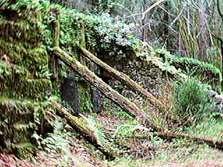 The trail turns left to reach the front of the kilns. Do not take the trail that goes straight ahead, as this will take you up to the Felton-Empire road. These once proud kilns now require timber support to prevent their collapse. A total of 15 to 17 men were involved in the operations. The fires were kept burning, 24 hours a day for 3-4 day periods. Most of the workers lived in cabins located around the kilns and barrel mill.
