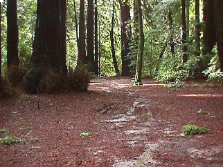 Here the Redwood Grove trail reaches its furthest distance from the parking. Those who are tired should now return to the nature center by following the return loop. To extend the hike, go through the opening in the fence near Fremont tree. This short spur trail will lead to Pipeline road. You will pass near the railroad tracks used by the trains in Roaring Camp.