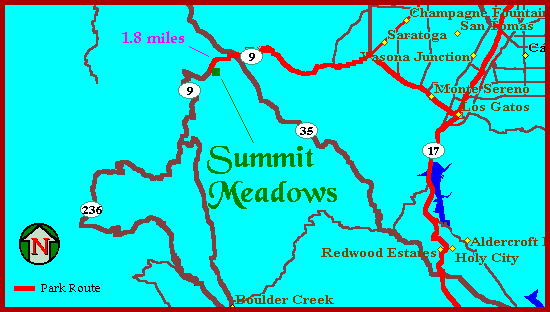From the town of Saratoga in the Santa Clara County, take highway 9 west through the town and into the Santa Cruz Mountains. At the intersection of highway 35 (Skyline Blvd.) continue on Highway 9 for 1.8 miles. There is a large pullout on the left that allows for ample parking. On the right a sign for a Boy Scout Camp may be present but there is no sign marking Summit Meadows.